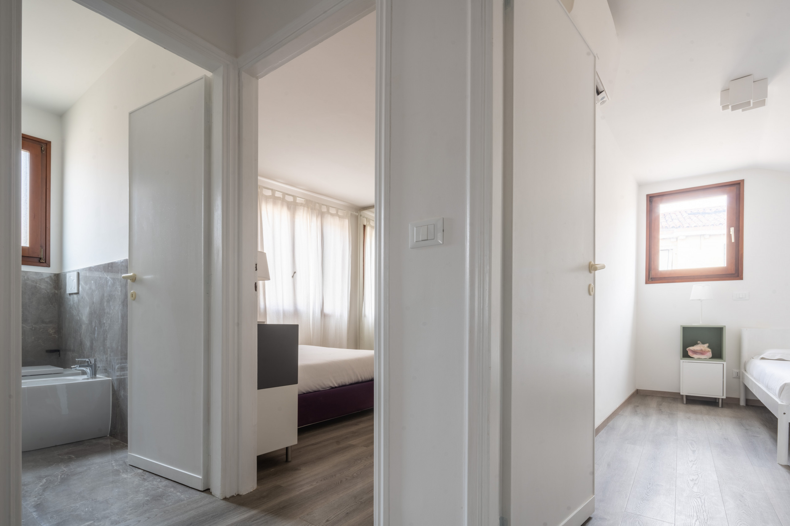 Questo luminoso appartamento fresco di restauro arredamento è situato al terzo piano di un palazzo a due passi da Campo San Giacomo dall’Orio.