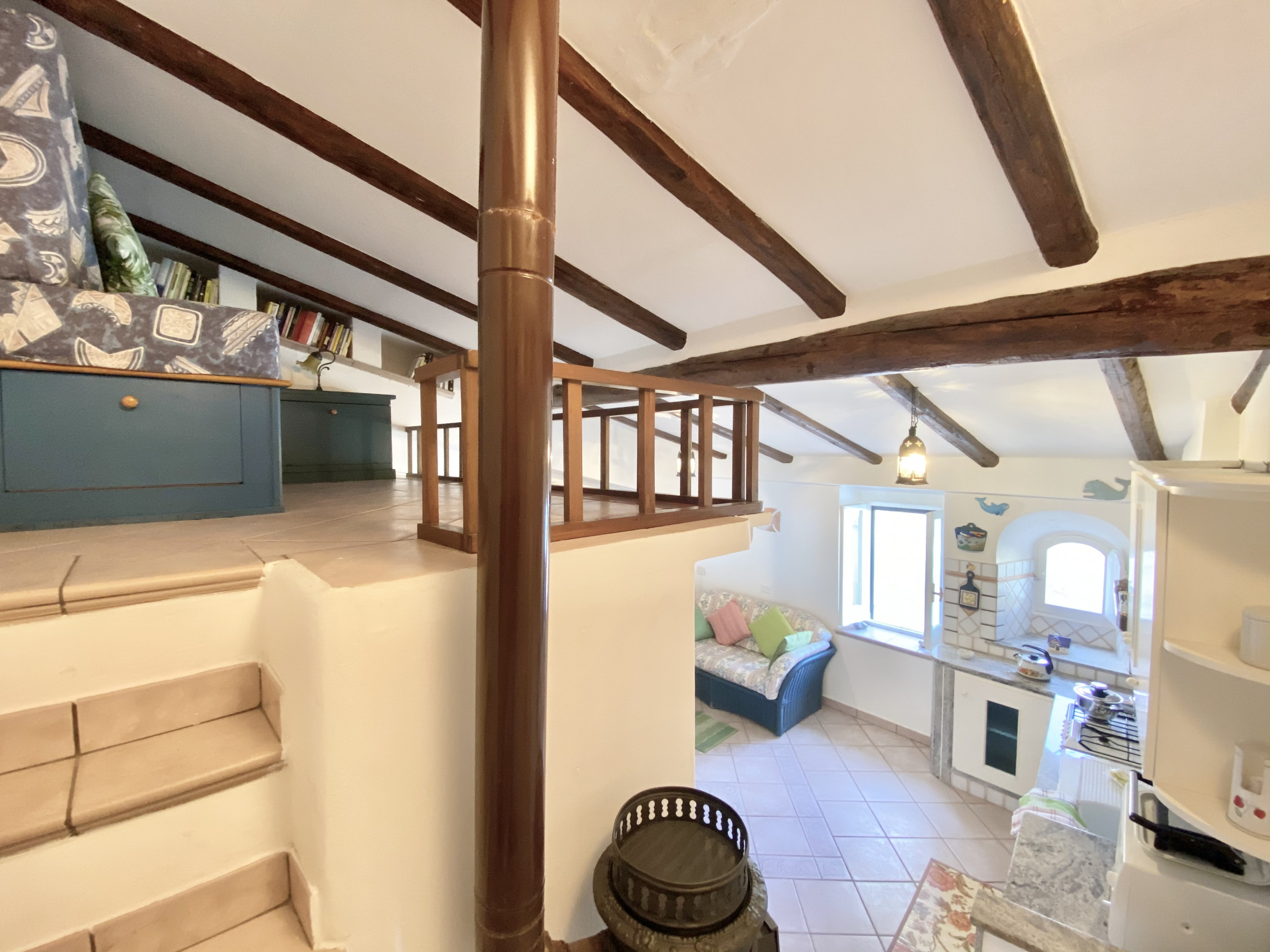 Appena all'ingresso veniamo subito colpiti da delle storiche travi in legno che caratterizzano tutto la casa. Proseguendo ci ritroviamo subito all'interno, dove troviamo sulla nostra sinistra la camera da letto matrimoniale con alti soffitti e travi in legno, caratteristica comune delle case storiche di Sperlonga, continuando e scendendo due gradini troviamo un piccolo soppalco dove abbiamo un divano letto singolo, comodo per una persona ed un bagno con doccia.