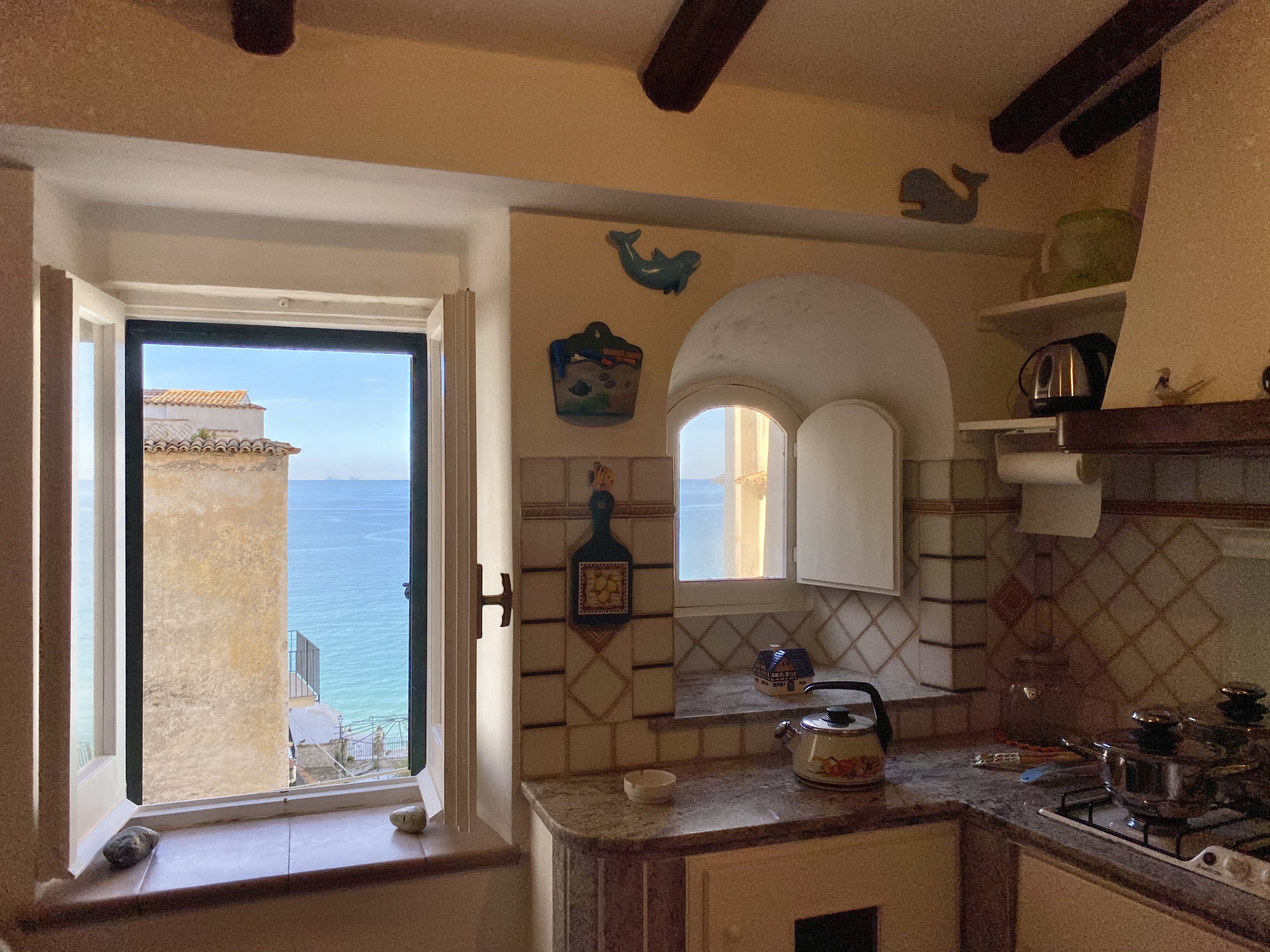 La particolarità di questo appartamento risiede, oltre nei dettagli, anche nella splendida vista sul mare ammirabile dalle due finestre della sala, da cui potrete ammirare dei bellissimi tramonti.