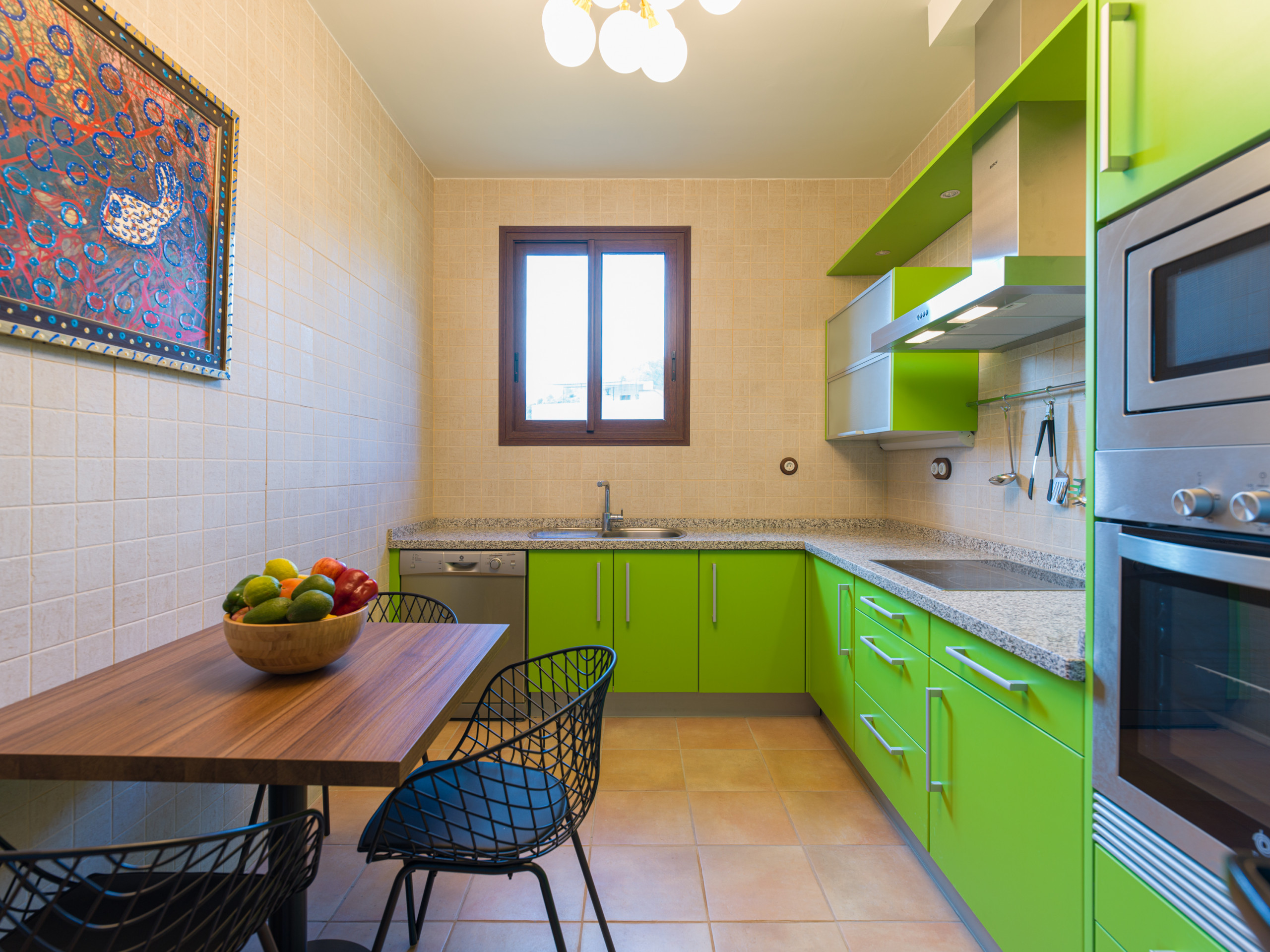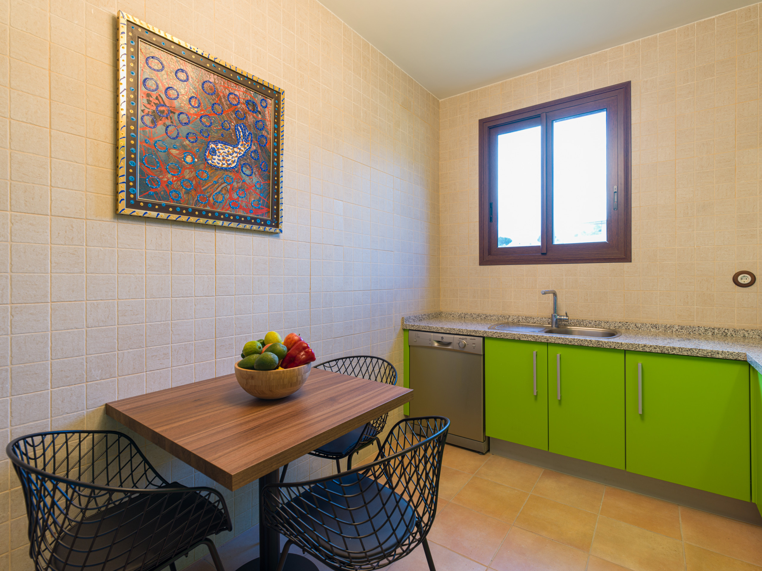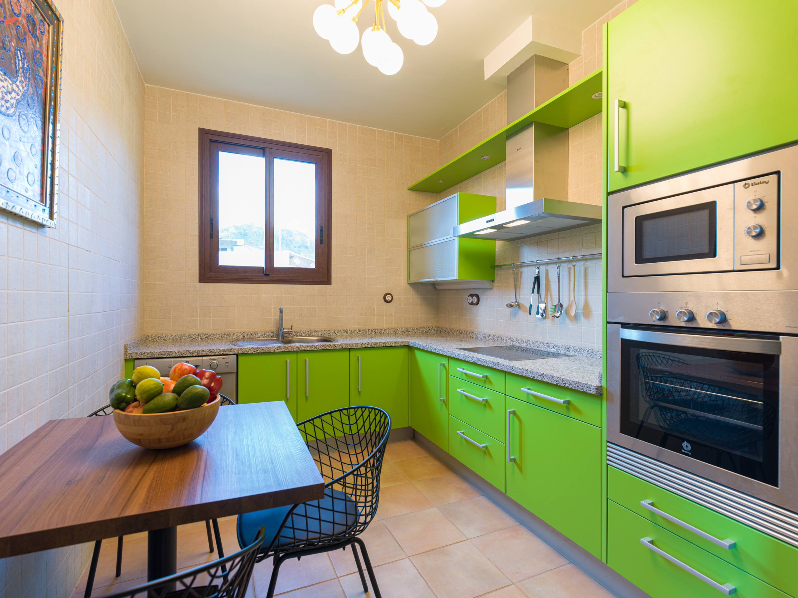 La cucina è completamente attrezzata con elettrodomestici moderni come lavatrice, lavastoviglie, forno, macchina da caffè, tostapane, bollitore e stoviglie complete. Ideale per preparare pasti e godersi momenti gastronomici in famiglia o con amici. Inoltre, dispone di connessione WiFi per rimanere in contatto e di un televisore per momenti di intrattenimento.