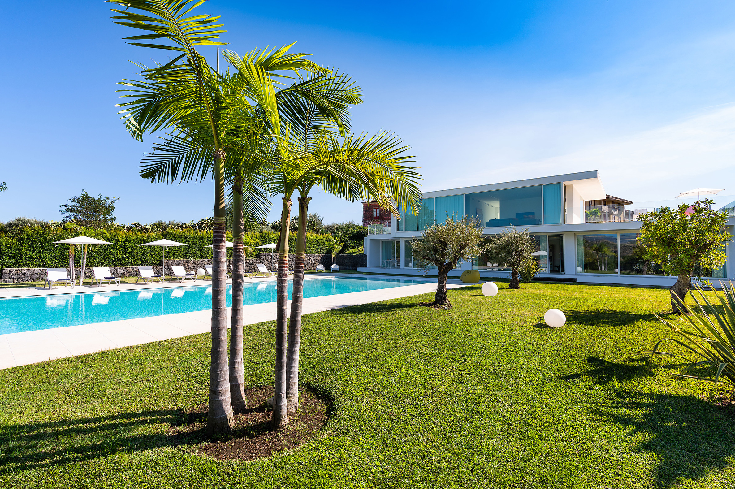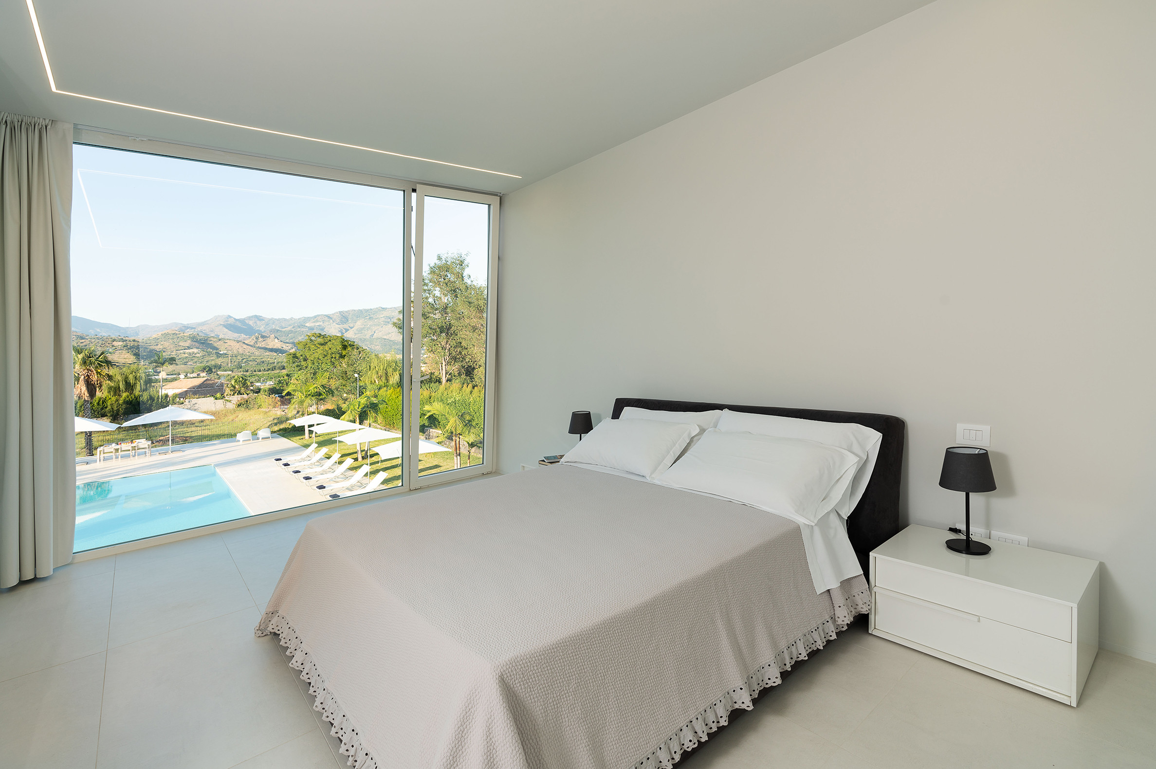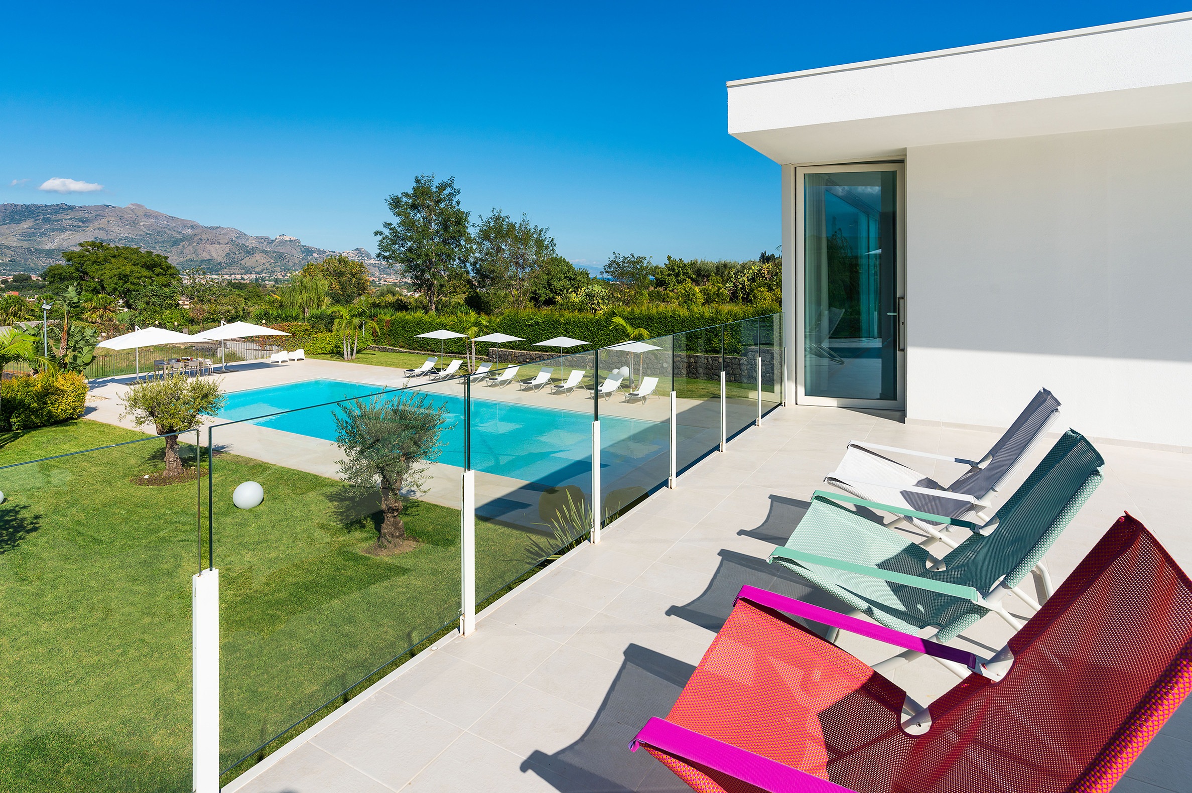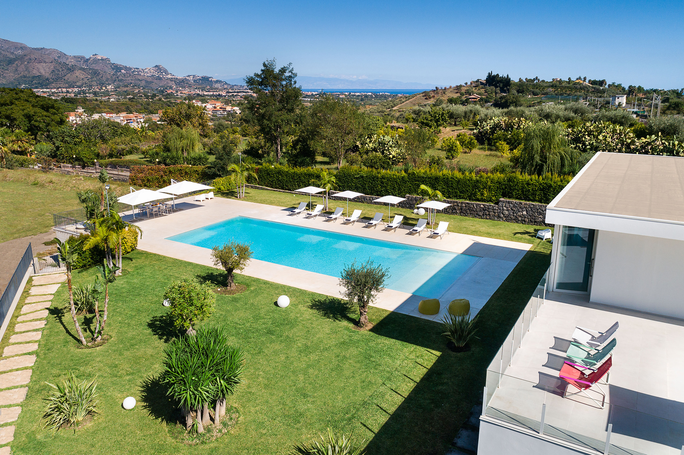 Villa Greta è una lussuosa villa con piscina situata nei dintorni di Taormina. Ideale per una vacanza confortevole e rilassante, la villa è circondata da uno splendido giardino con prato inglese, che ospita ampie terrazze, la grande piscina privata (mt 8 x 21) e la vasca idromassaggio. Di recente costruzione, questa esclusiva residenza contemporanea è costituita da una casa padronale e da una dependance. La casa padronale - che si sviluppa su due livelli - dispone di accoglienti e luminosi ambienti interni aperti sul giardino e sul paesaggio circostante attraverso grandi vetrate a tutt’altezza. Il piano terra comprende una zona living con cucina, una lussuosa suite matrimoniale con vasca idromassaggio a vista e bagno privato, due camere matrimoniali con bagno ed un quarto bagno con doccia. Al primo piano, collegato tramite scala esterna, si trovano un secondo soggiorno-pranzo con cucina, una camera matrimoniale con bagno privato, una camera doppia e un bagno di servizio. Mentre la dependance accoglie una zona giorno con angolo cottura, due camere da letto e due bagni. La villa dispone inoltre di una zona benessere con sauna e tapis-roulant e di numerosi comfort, quali A/C, internet Wi-Fi, 8 TV, ricevitore satellitare, asciugatrice, 2 lavatrici, 2 lavastoviglie, cassaforte e barbecue. Da villa Greta, si raggiungono in pochi minuti di auto il suggestivo centro storico di Taormina e il mare. Nei dintorni si trovano anche le spiagge di Fondachello e Giardini Naxos, il Parco dell’Etna e le gole dell’Alcantara, i borghi marinari della Riviera dei Ciclopi, Catania e Siracusa.