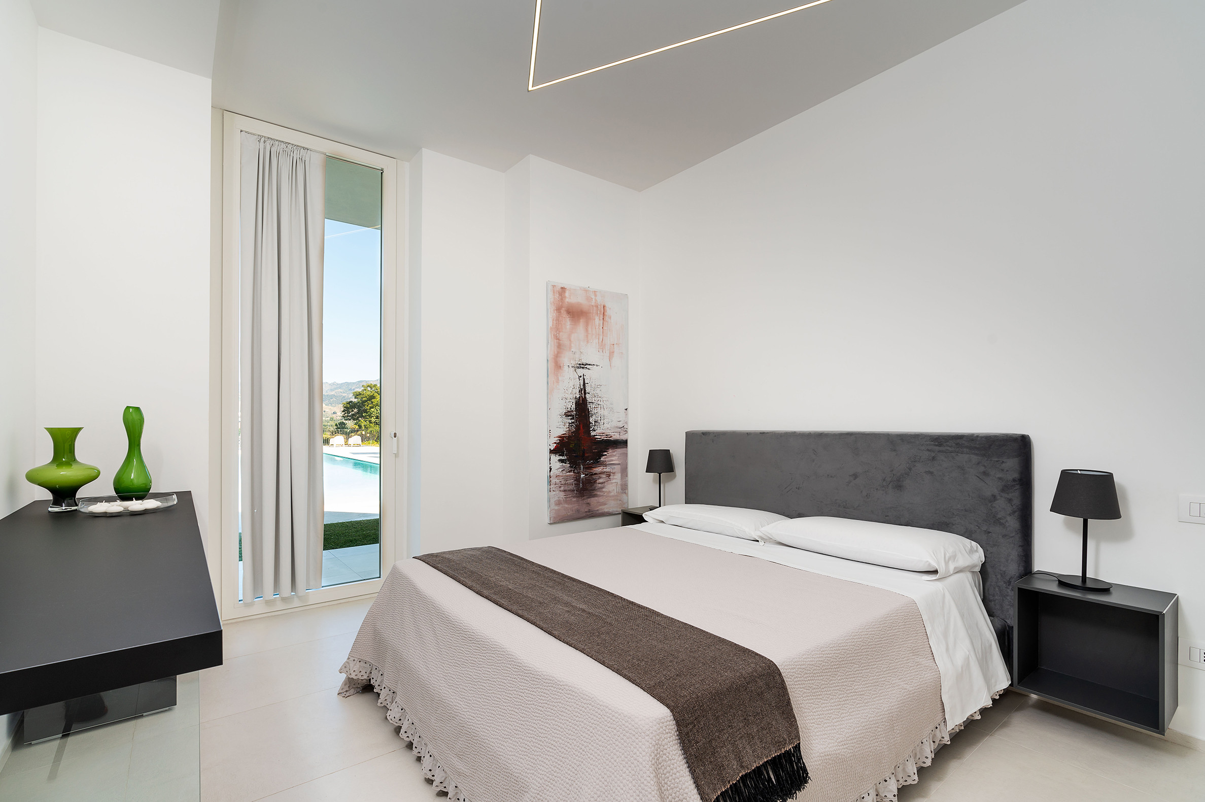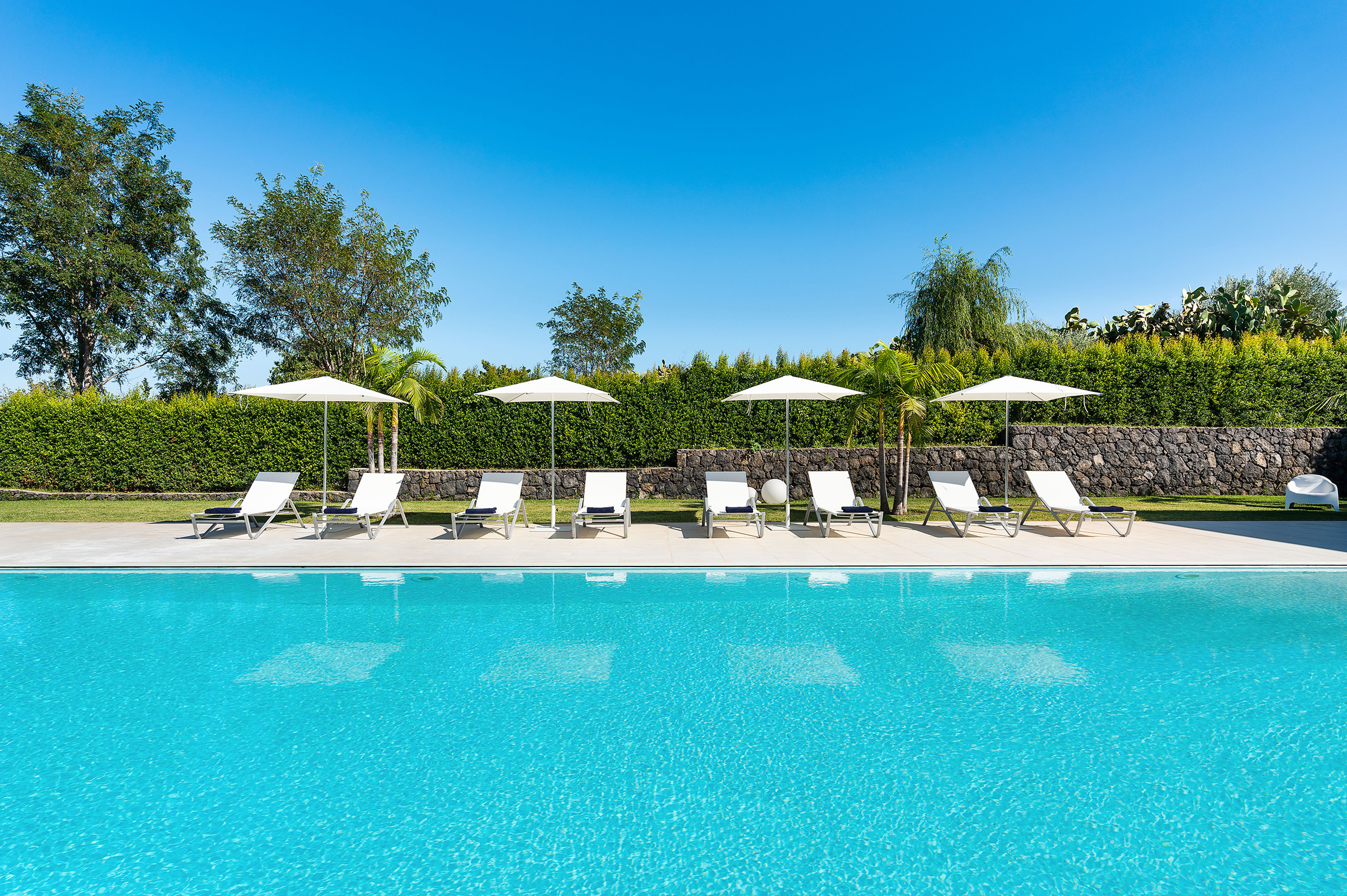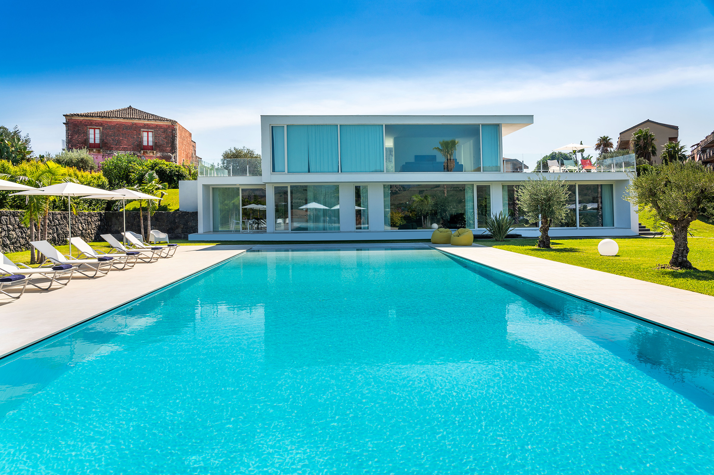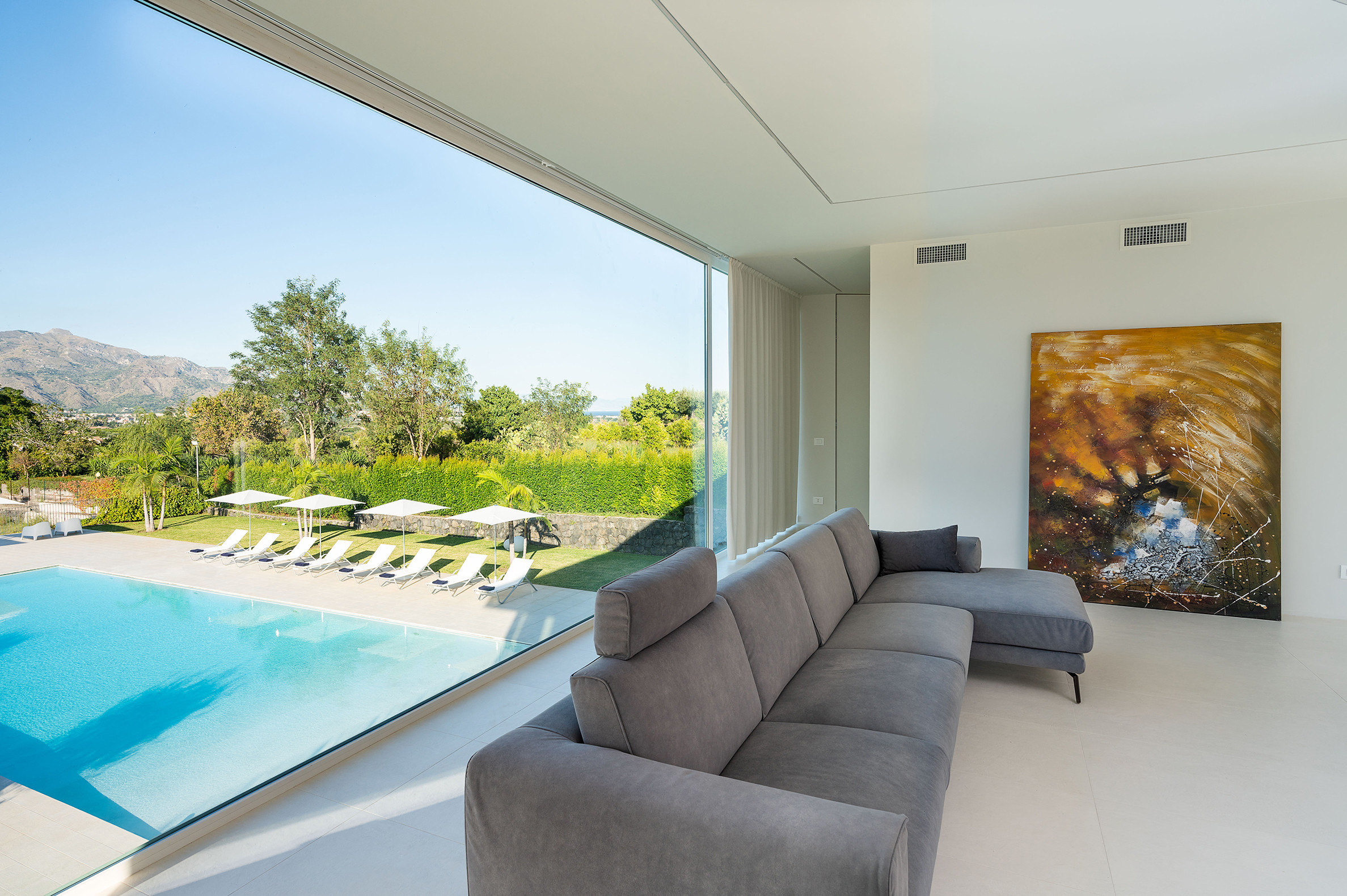 Villa Greta è una lussuosa villa con piscina situata nei dintorni di Taormina. Ideale per una vacanza confortevole e rilassante, la villa è circondata da uno splendido giardino con prato inglese, che ospita ampie terrazze, la grande piscina privata (mt 8 x 21) e la vasca idromassaggio. Di recente costruzione, questa esclusiva residenza contemporanea è costituita da una casa padronale e da una dependance. La casa padronale - che si sviluppa su due livelli - dispone di accoglienti e luminosi ambienti interni aperti sul giardino e sul paesaggio circostante attraverso grandi vetrate a tutt’altezza. Il piano terra comprende una zona living con cucina, una lussuosa suite matrimoniale con vasca idromassaggio a vista e bagno privato, due camere matrimoniali con bagno ed un quarto bagno con doccia. Al primo piano, collegato tramite scala esterna, si trovano un secondo soggiorno-pranzo con cucina, una camera matrimoniale con bagno privato, una camera doppia e un bagno di servizio. Mentre la dependance accoglie una zona giorno con angolo cottura, due camere da letto e due bagni. La villa dispone inoltre di una zona benessere con sauna e tapis-roulant e di numerosi comfort, quali A/C, internet Wi-Fi, 8 TV, ricevitore satellitare, asciugatrice, 2 lavatrici, 2 lavastoviglie, cassaforte e barbecue. Da villa Greta, si raggiungono in pochi minuti di auto il suggestivo centro storico di Taormina e il mare. Nei dintorni si trovano anche le spiagge di Fondachello e Giardini Naxos, il Parco dell’Etna e le gole dell’Alcantara, i borghi marinari della Riviera dei Ciclopi, Catania e Siracusa.