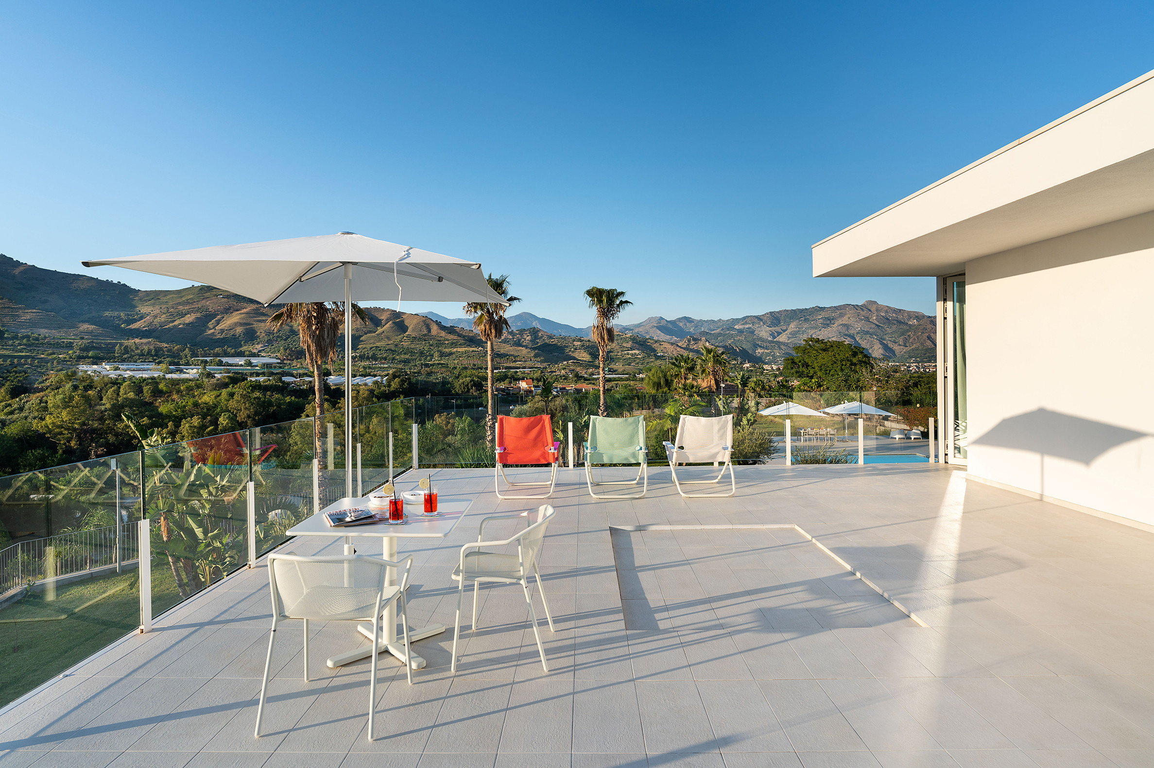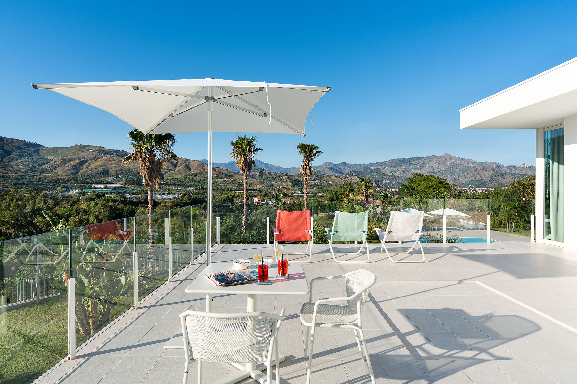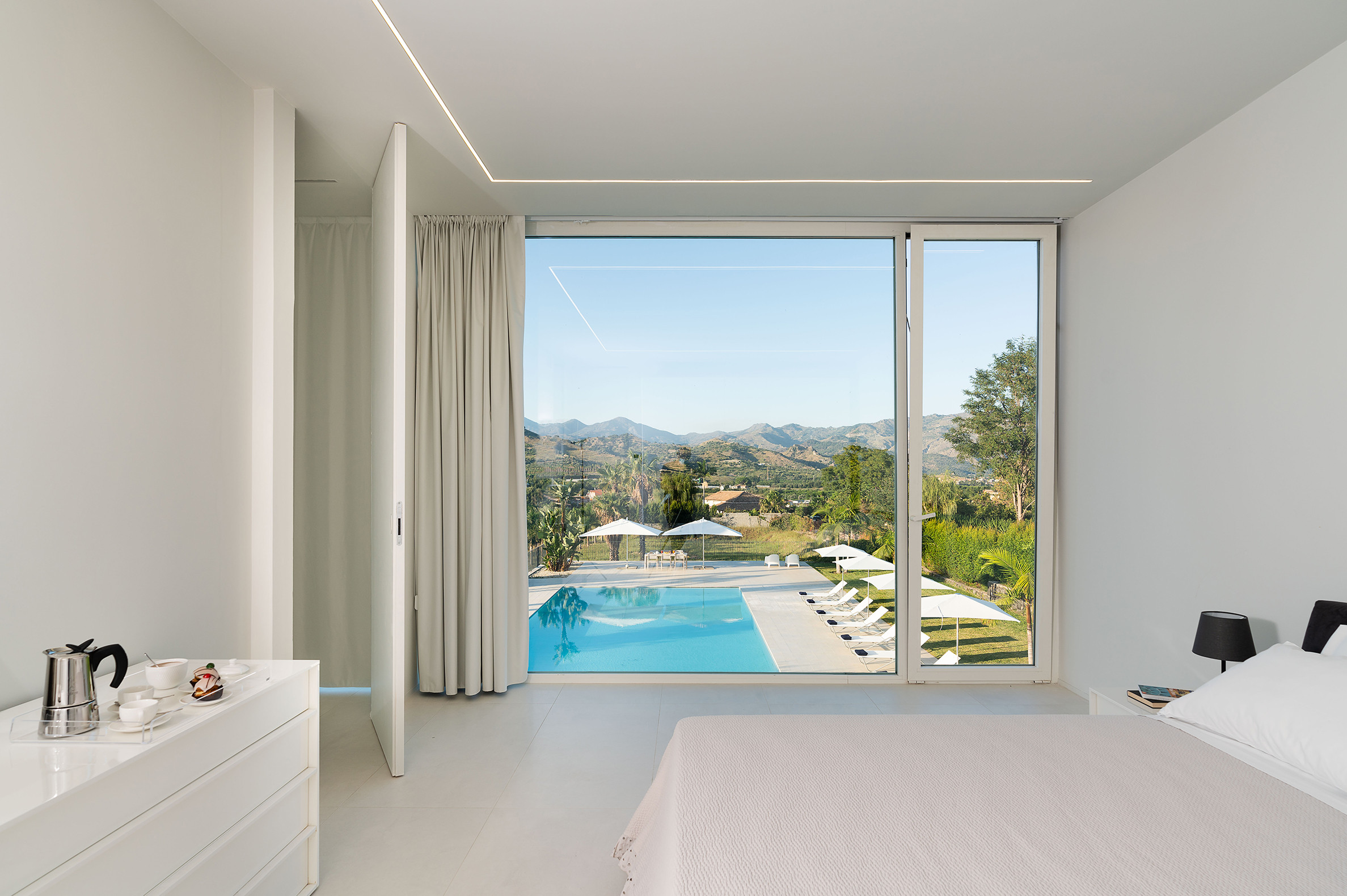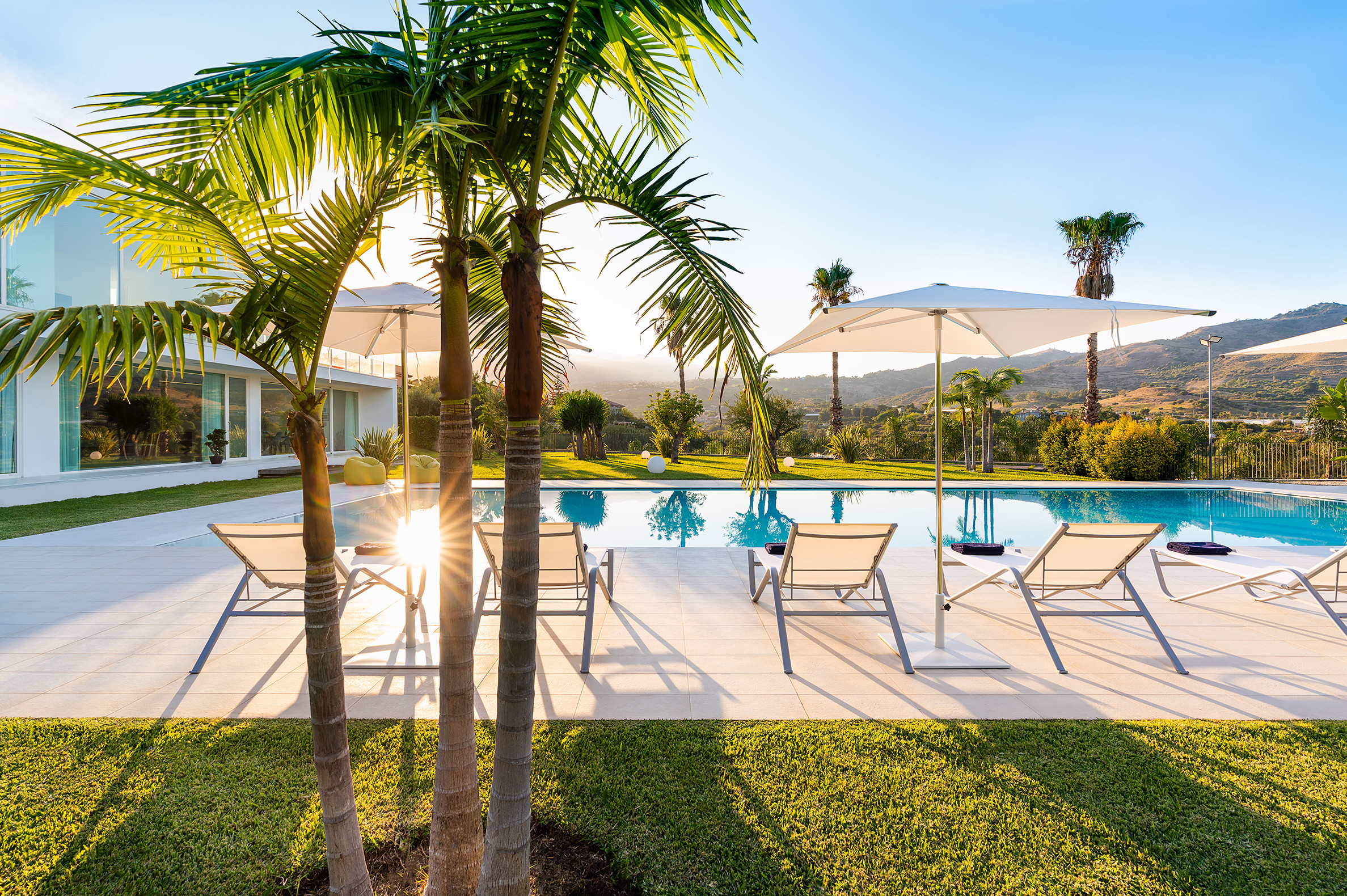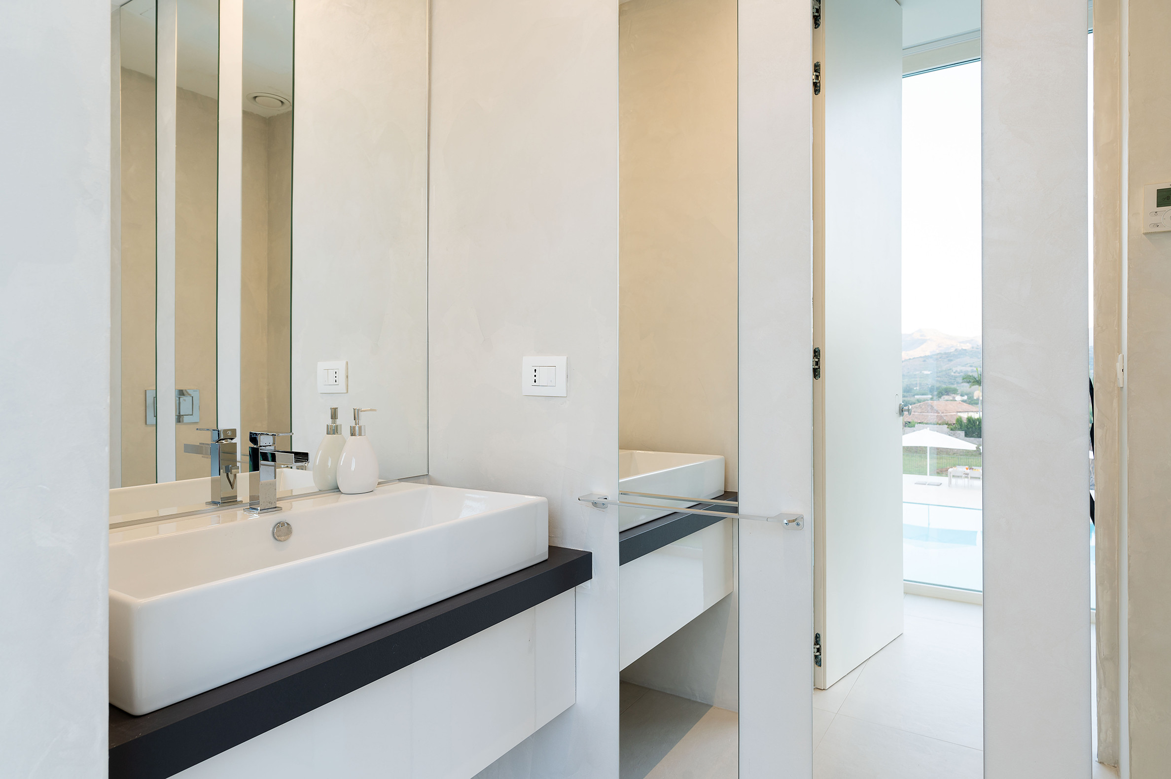 Villa Greta è una lussuosa villa con piscina situata nei dintorni di Taormina. Ideale per una vacanza confortevole e rilassante, la villa è circondata da uno splendido giardino con prato inglese, che ospita ampie terrazze, la grande piscina privata (mt 8 x 21) e la vasca idromassaggio. Di recente costruzione, questa esclusiva residenza contemporanea è costituita da una casa padronale e da una dependance. La casa padronale - che si sviluppa su due livelli - dispone di accoglienti e luminosi ambienti interni aperti sul giardino e sul paesaggio circostante attraverso grandi vetrate a tutt’altezza. Il piano terra comprende una zona living con cucina, una lussuosa suite matrimoniale con vasca idromassaggio a vista e bagno privato, due camere matrimoniali con bagno ed un quarto bagno con doccia. Al primo piano, collegato tramite scala esterna, si trovano un secondo soggiorno-pranzo con cucina, una camera matrimoniale con bagno privato, una camera doppia e un bagno di servizio. Mentre la dependance accoglie una zona giorno con angolo cottura, due camere da letto e due bagni. La villa dispone inoltre di una zona benessere con sauna e tapis-roulant e di numerosi comfort, quali A/C, internet Wi-Fi, 8 TV, ricevitore satellitare, asciugatrice, 2 lavatrici, 2 lavastoviglie, cassaforte e barbecue. Da villa Greta, si raggiungono in pochi minuti di auto il suggestivo centro storico di Taormina e il mare. Nei dintorni si trovano anche le spiagge di Fondachello e Giardini Naxos, il Parco dell’Etna e le gole dell’Alcantara, i borghi marinari della Riviera dei Ciclopi, Catania e Siracusa.