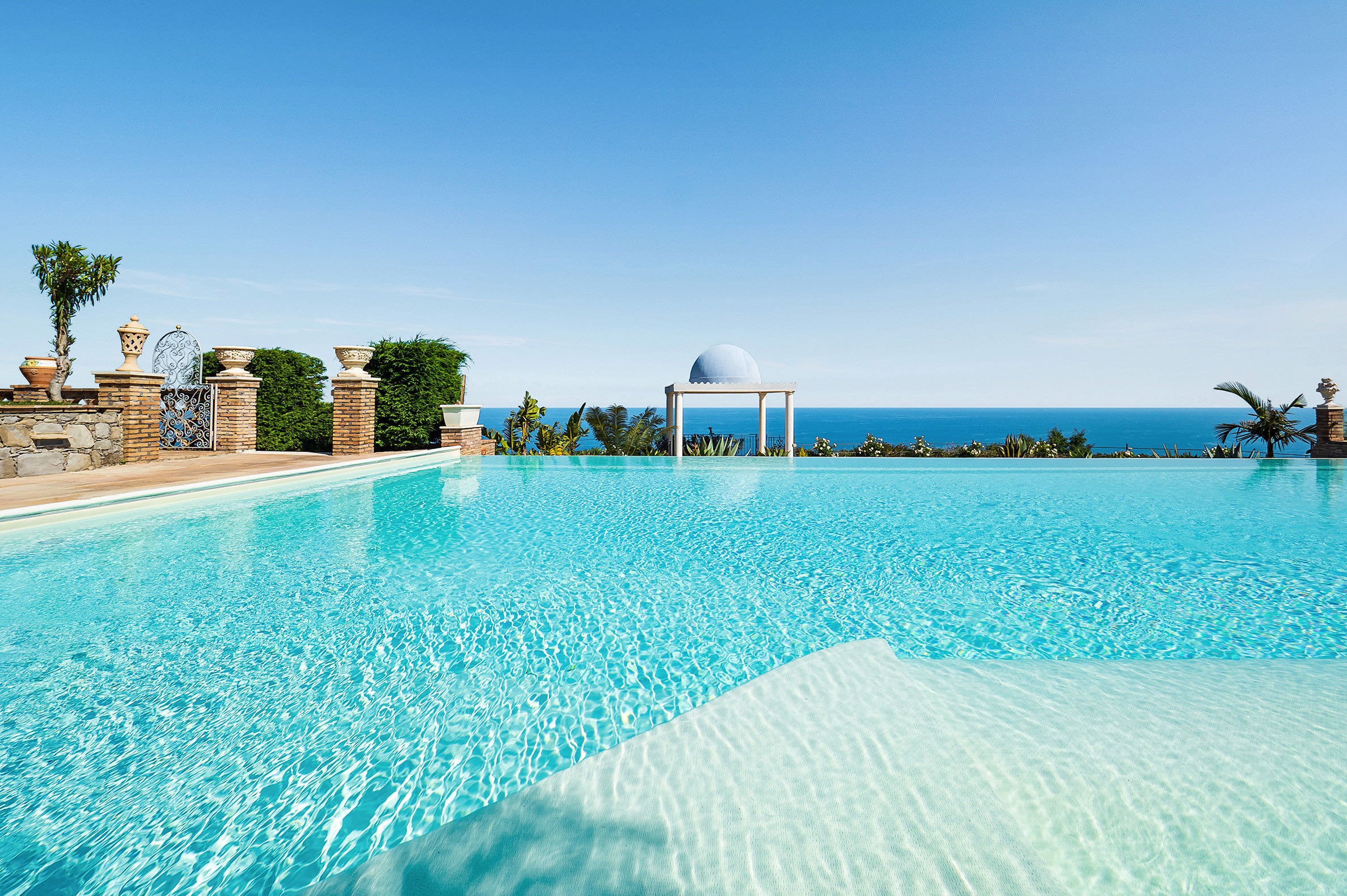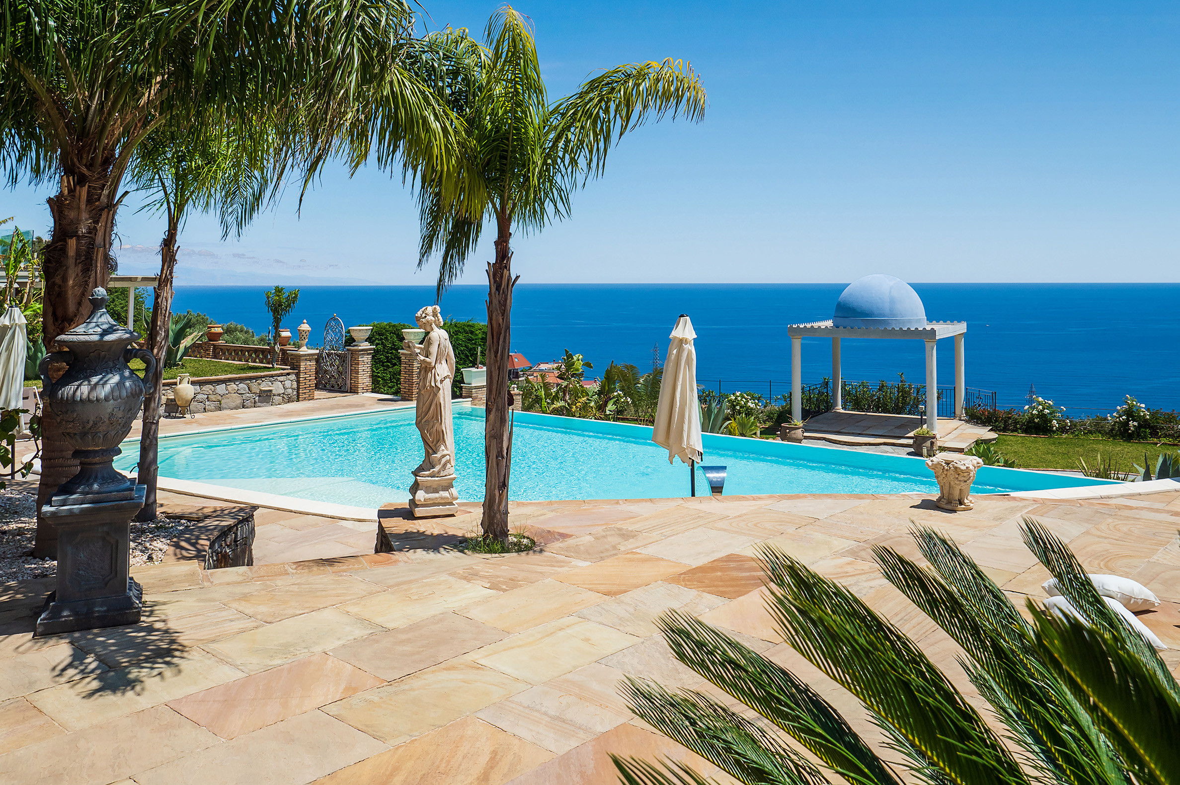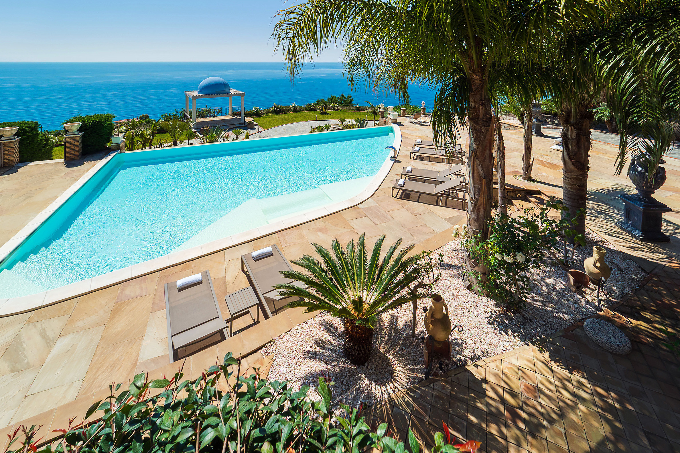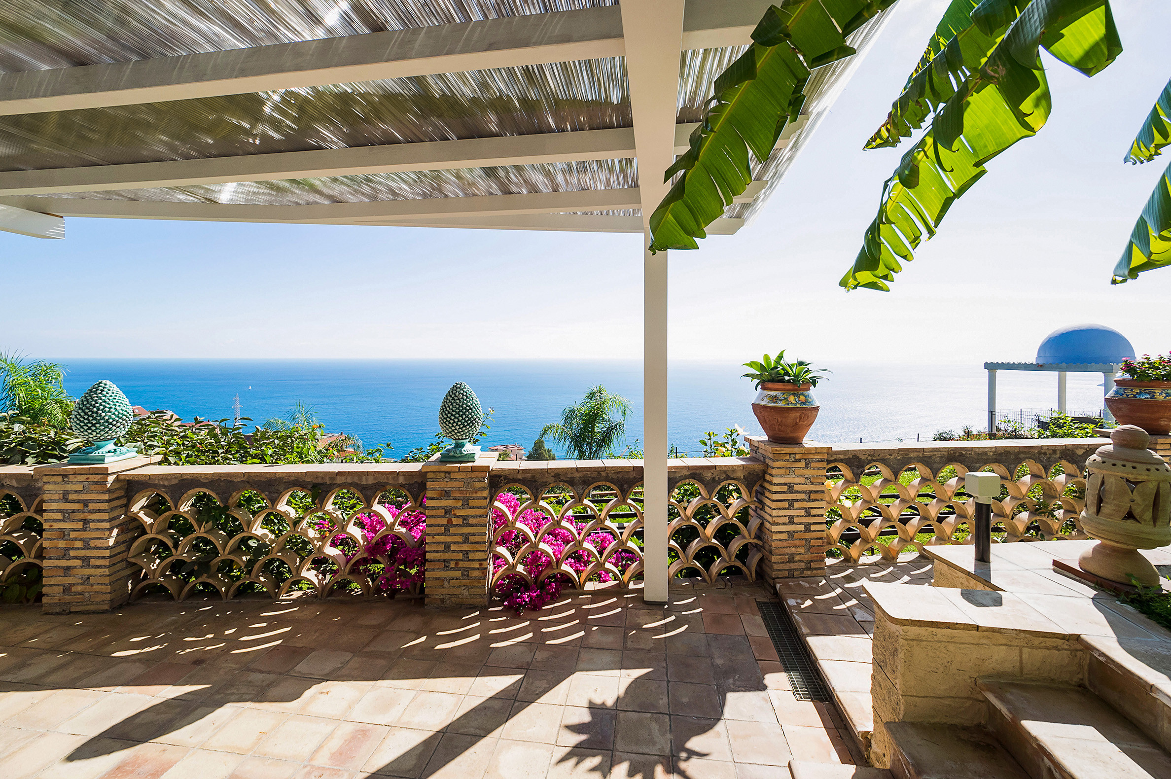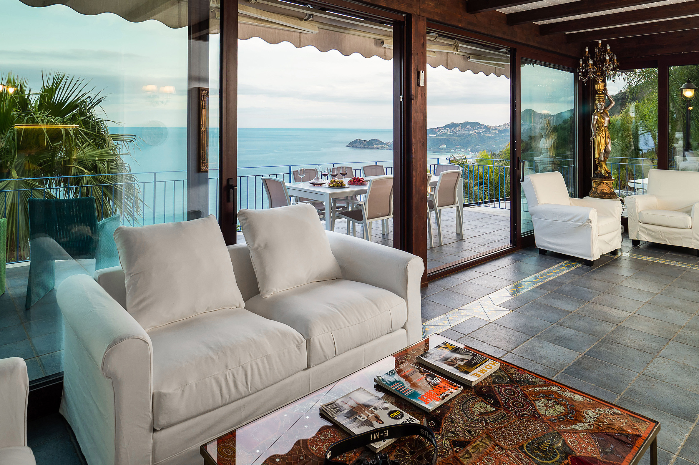 di Taormina. Maestosa ed elegante, la residenza regala un’incantevole vista sul mare e sulla baia di Taormina, bella da ammirare, sia di giorno che di sera, dalla spettacolare piscina a sfioro e dalle sue ampie terrazze attrezzate. Circondata da un grande, curato e rigoglioso giardino, questa splendida villa di recente costruzione offre ambienti interni originali ed accoglienti arredati in una piacevole combinazione di stili, che comprendono uno spazioso soggiorno, una cucina e quattro camere matrimoniali, tutte dotate di bagno privato ed accesso indipendente dalle terrazze. La villa è inoltre dotata di vasca idromassaggio esterna, aria condizionata, internet Wi-Fi, TV satellitare, lavatrice e lavastoviglie. Dalla dimora si possono raggiungere in pochi minuti di auto le vicine spiagge di Letojanni, Mazzarò e dell’Isola Bella, ma anche visitare agevolmente Catania e Siracusa, i paesini del Parco dell’Etna, le gole dell’Alcantara ed i borghi marinari della Riviera dei Ciclopi.