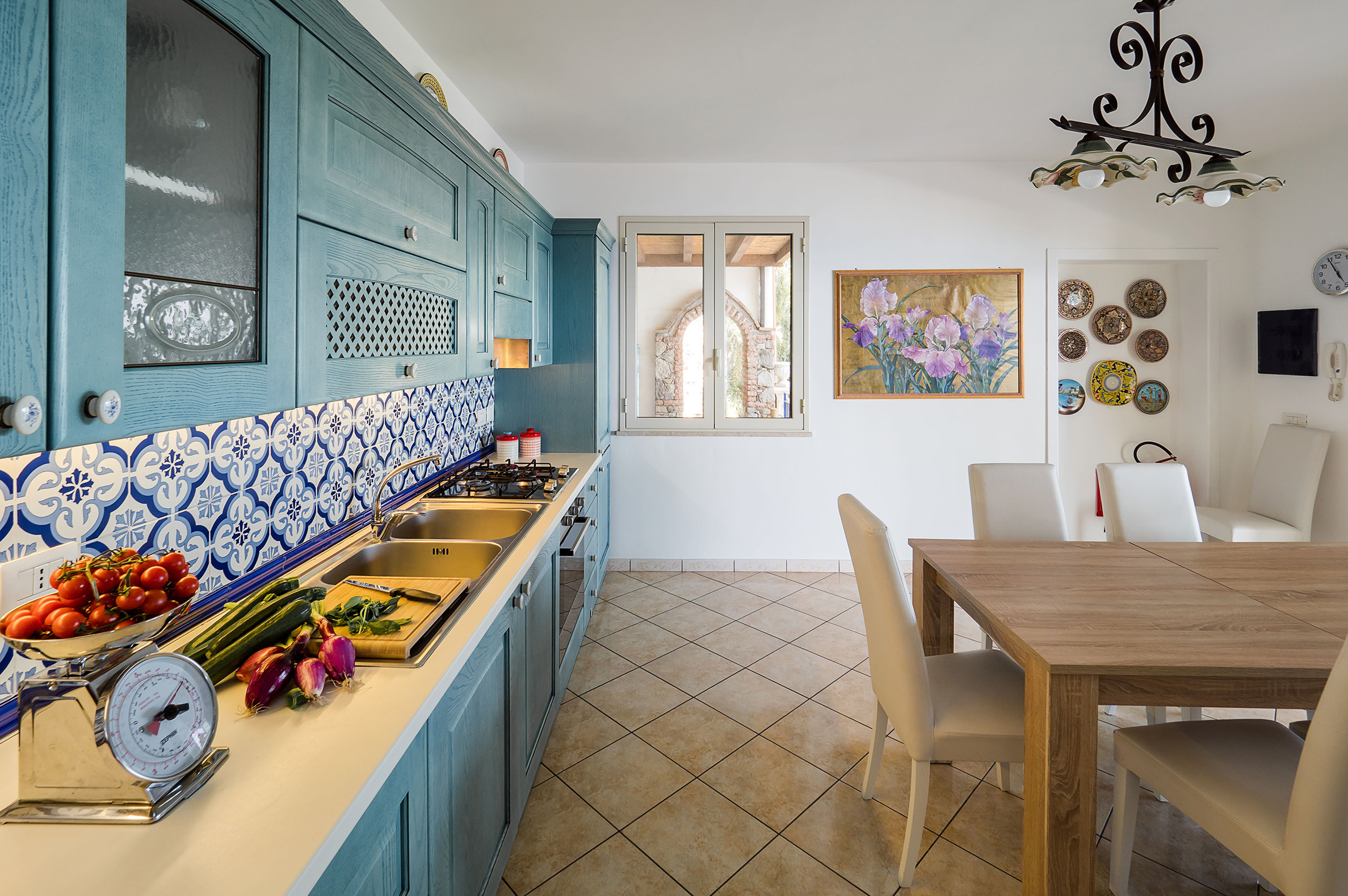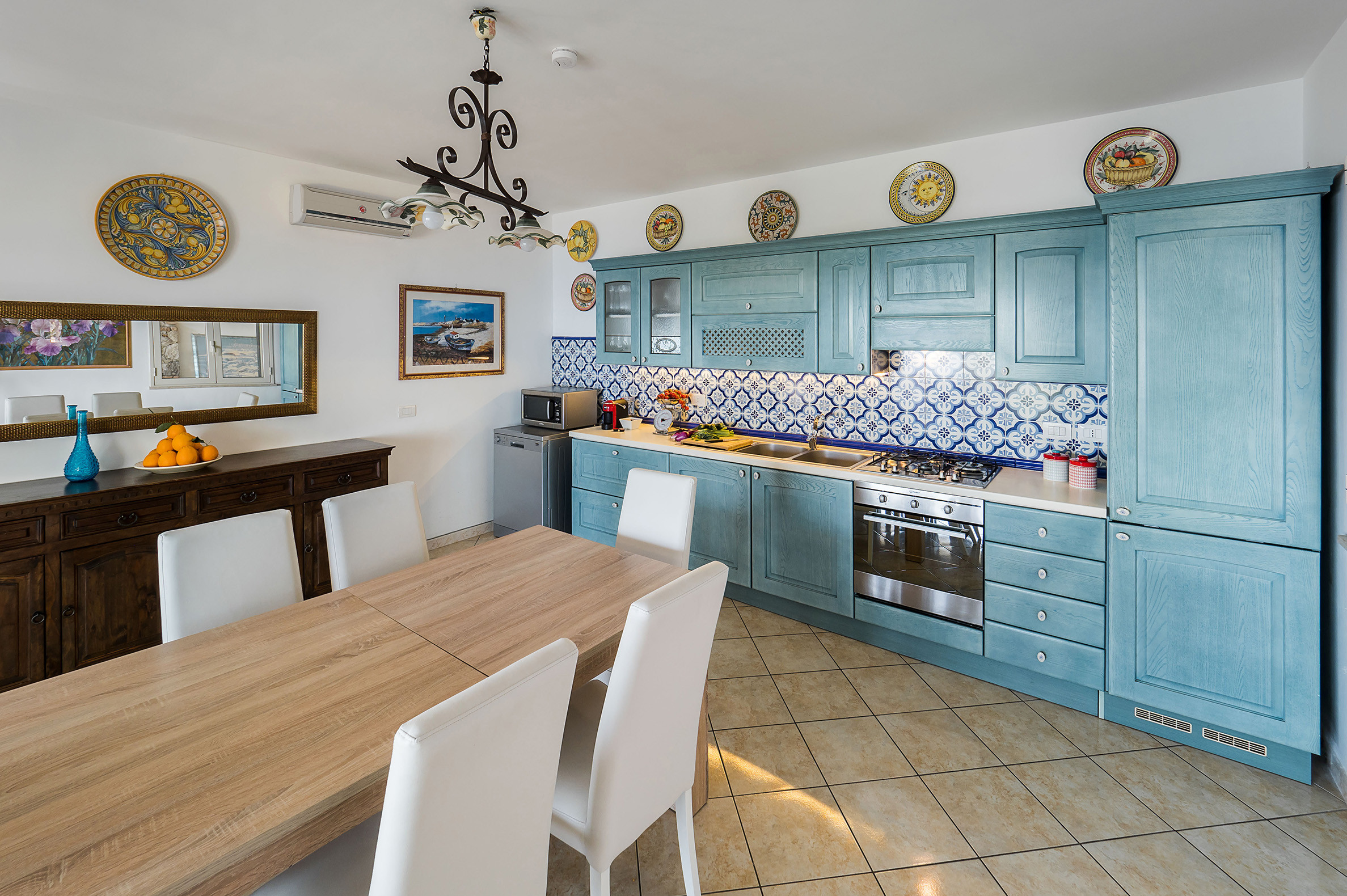 CASA PADRONALE Primo Piano: soggiorno, cucina abitabile, 1 camera matrimoniale con bagno-doccia, terrazza. Piano Terra (con accesso dall’esterno): 2 camere matrimoniali con frigobar e bagno-doccia, lavanderia, terrazza. DEPENDANCE Piano Terra: 1 camera matrimoniale con frigobar e bagno-vasca e doccia.